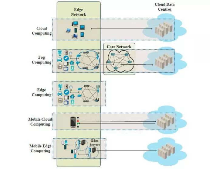 雾计算由思科提出,通过在终端和云数据中心之间增加一些带有存储器的小服务器、路由器或其他网络组件,形成一个具备数据处理和存储能力的中间层,既可以覆盖在边缘网络,也可以拓展到核心网。