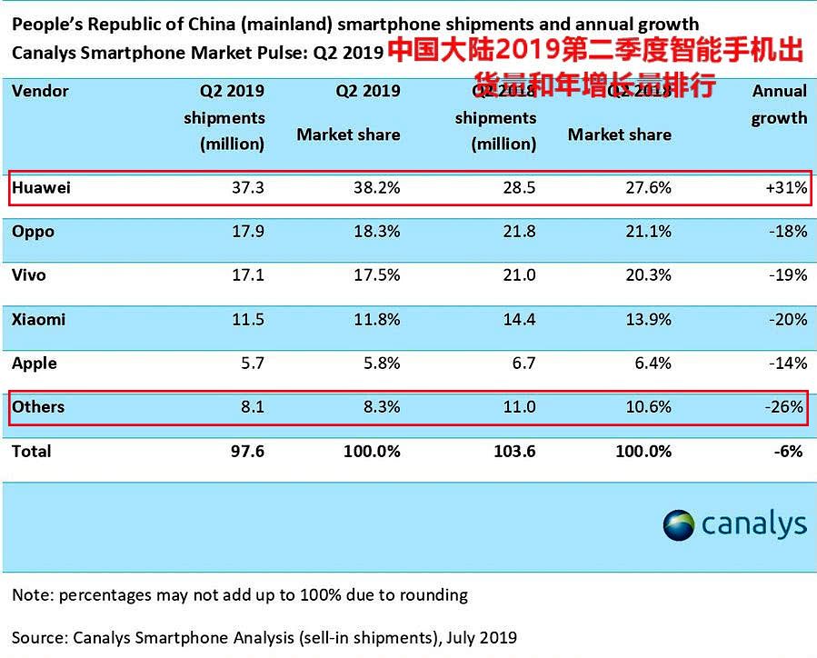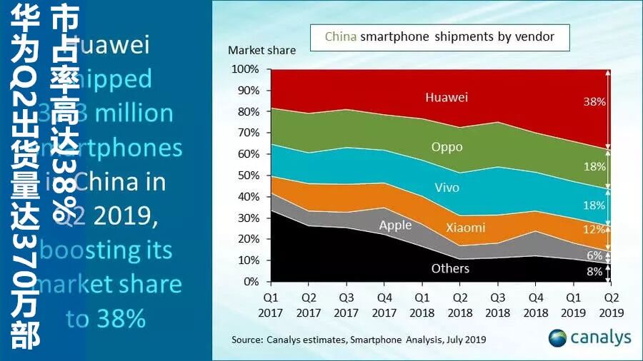 终端领域,华为财报显示,该公司上半年平板电脑业务同比增长10%;PC增长3倍;可穿戴设备增长2倍;云服务生态用户超过5亿;智能手机出货(含荣耀)达到1.18亿部,同比增涨24%。值得一提,就中国市场而言,今天咨询公司Canalys数据显示,华为手机出货量在二季度猛增31%,以38%的市占率登顶中国市场。这在一众友商市占率双位数下滑的前提下,属实罕见。
