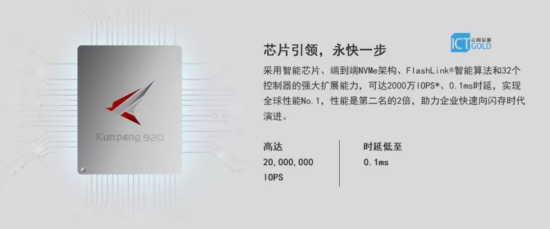 华为为什么能够拥有如此极致的性能水平呢?谢黎明解释道,这来源于三个方面,第一,端到端IO处理的芯片,在传、算、存、管,基于鲲鹏920、网络芯片、管理芯片、SSD芯片以及昇腾AI芯片310构建端到端极速平台,提供极致性能,实现2000万IOPS以及0.1ms时延,以更快响应满足应用实时化诉求。