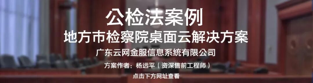 此方案是由云网金服资深售前工程师杨远平先生为广东省某地方市检察院制作的桌面云解决方案案例,欢迎各位到云网金服官网查阅(www.ictgold.com),或点击左下角“阅读原文”即可查看桌面云解决方案解决案例。