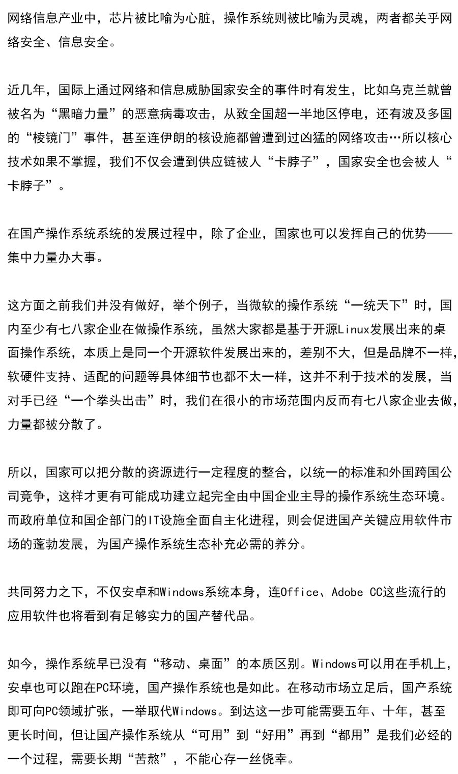 但都以失败告终,Windows全面占据了国内PC市场。后来智能手机兴起,iOS、安卓又瓜分了移动平台系统份额。