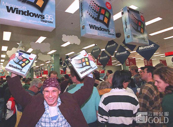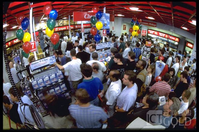美国民众连夜排队抢购着当时最新最先进最潮的操作系统软件