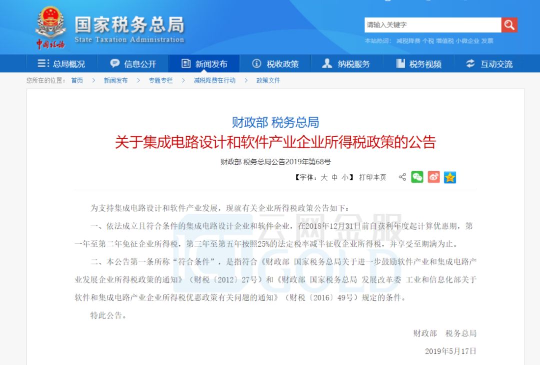 而在这次事件发生后,不知道是不是国家有所觉察,国家财政部、税务总局发布公告,明确2018年度集成电路设计和软件企业将继续享受此前“两免三减半”的所得税优惠,简直就是重磅减税政策利好!